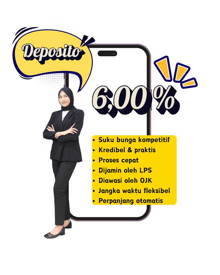 Deposito adalah penempatan sejumlah dana yang ditempatkan di Bank/BPR/BPRS dengan jangka waktu tertentu [1 bulan/3 bulan/6 bulan/12 bulan]. Umumnya bunga Deposito lebih tinggi dari bunga Tabungan dan penempatan dana dalam Deposito Berjangka merupakan sarana investasi yang menguntungkan, efektif dan terencana.